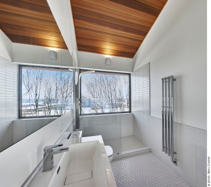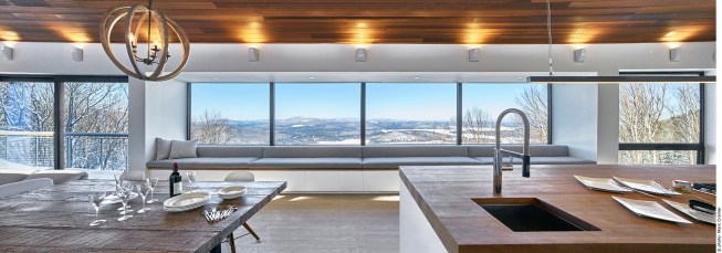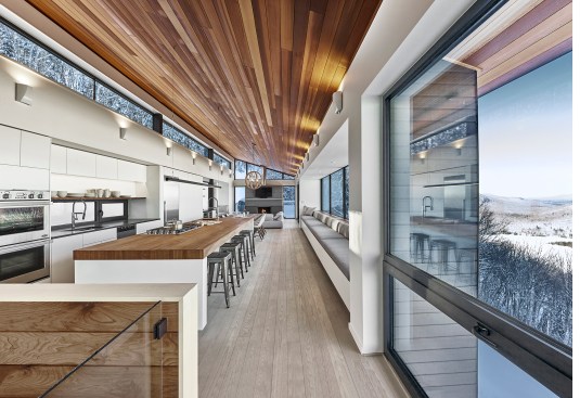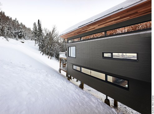 Montréal, Canada, 2016-03-14 -This modern ski chalet was designed as a weekend retreat for a family with school age children. Sited on the steep slope of a former ski hill, Mont-Jasper, near the village of Saint-Donat. At an elevation of 2,435 feet above sea level, the site is among the highest residential building lots in the Laurentians and Lanaudière regions. From this elevation, surrounded by a dense forest of spruce, maple, beech and birch trees, the chalet commands 100-mile panoramic views over beautiful Lac Archambault.