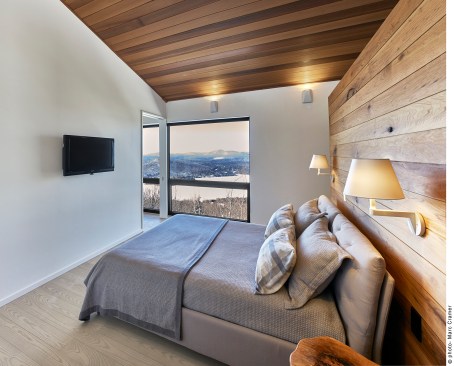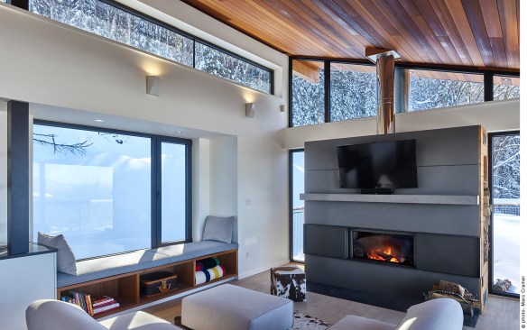 The home is accessed via an entry bridge, with the living level 30’ above grade. The main floor has an open plan connecting the kitchen, dining area, and living room. Spanning the length of the kitchen and dining areas is a 27-foot-long bay window and window seat. Below the upholstered seat cushions is concealed storage. A dramatic panoramic window wall runs the full width of the bay and focuses views on the remarkable landscape beyond. High on the opposite side of the chalet, a continuous clerestory window runs the full length of the house bringing in morning light and views of the mountain above.