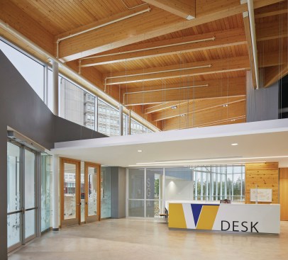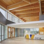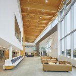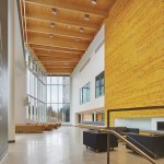 On the interior, a two-storey atrium lounge serves to build kinship amongst friends and classmates and cultivate pride-of-place. The multi-purpose space encourages students and visitors to meet and socialize; lounge and rest between classes; grab a quick bite to eat; or study quietly alone or in groups. Open sightlines foster community while a central fireplace ensures a comfortable home away from home.