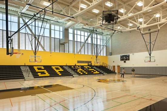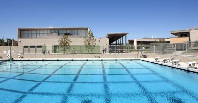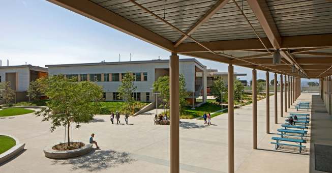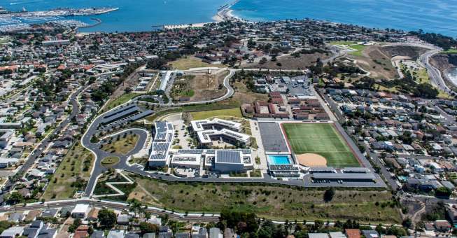 The new, sustainable San Pedro High School offers a collaborative learning environment based upon the small high school concept. The design creates an inviting campus environment that respects its rich historical site and embraces open views of the Pacific Ocean to the south and southwest. Main teaching space is organized into two small-school groupings – freestanding, two-story clusters of classroom buildings surrounding sunken courtyards. Five additional buildings house food services, library, performing arts, gymnasium, administrative, office and service/maintenance functions. The high school generates electricity from renewable energy on site through photovoltaic and wind turbine technology. Cool roofs, natural light and operable windows also help reduce energy consumption.
