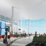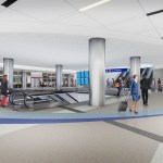 After baggage check-in and security screening at Tom Bradley International Terminal, passengers enter through the newly completed Bradley West Great Hall to the gateway extension. The spacious gateway building houses airline lounges and the escalators and elevators to the passenger tunnel below. Passengers can see the Midfield Satellite Concourse across the taxiway as they descend the escalator and traverse below the taxiway to the new concourse.