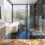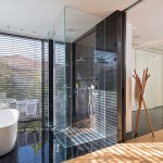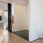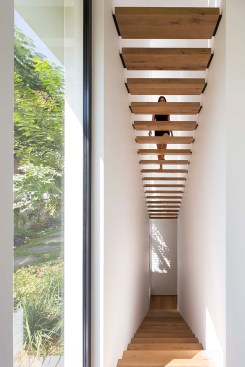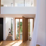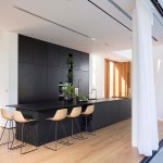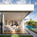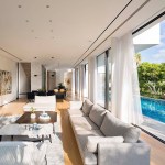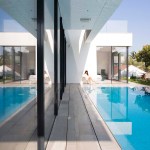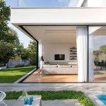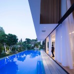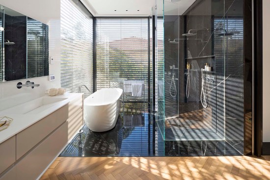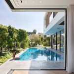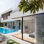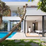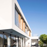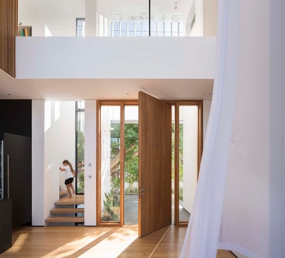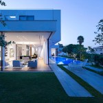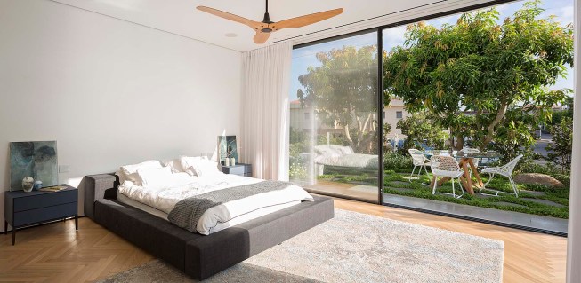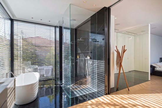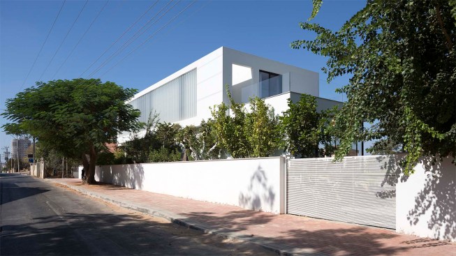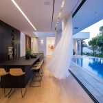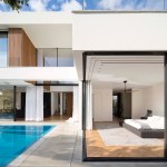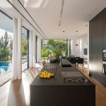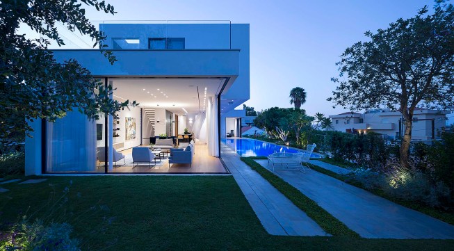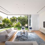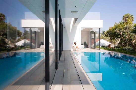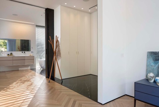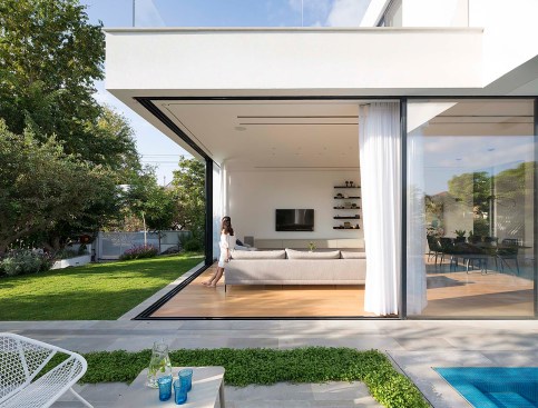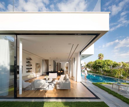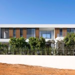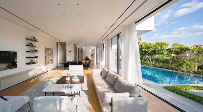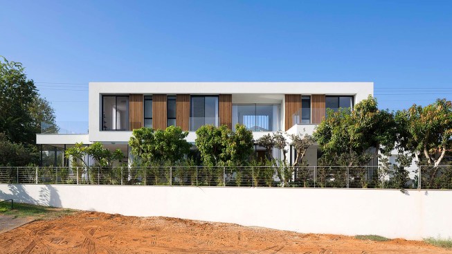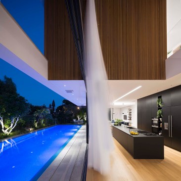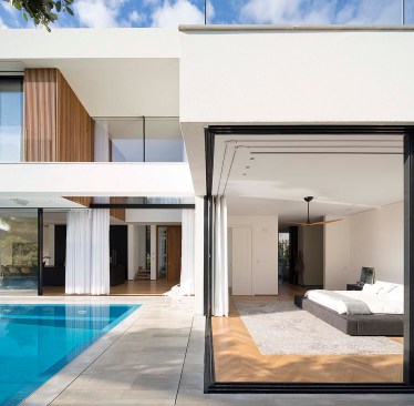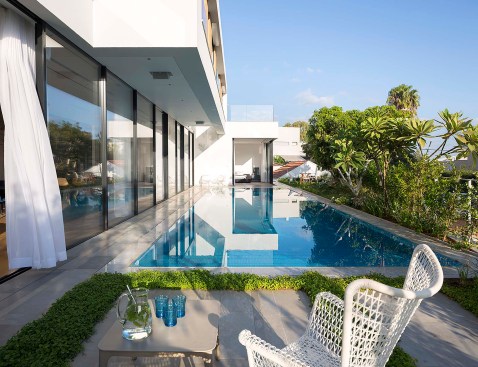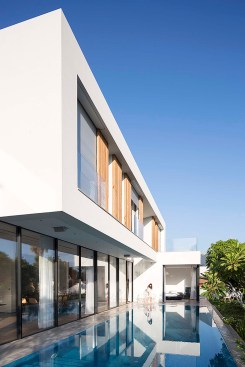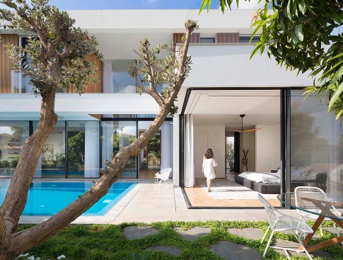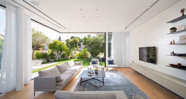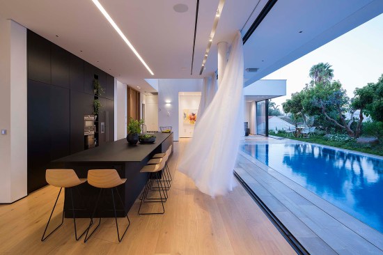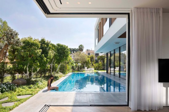 The house is built on a narrow trapezoid lot, bordering a small green public park with ancient Eucalyptus trees. The clients wanted the park to be seen as a continuation of their own private garden – The house was designed in an “L” shape to wrap around the swimming pool, facing the public park.The longer side of the house (28 meters) contains the living room, the dining area and the kitchen, while the shorter side contains the bedroom. The connection between the two sides is a double space containing the lobby. Vitrines are installed throughout the inner side of the house, enabling a direct connection with the outdoors. Additionally, to provide maximal openness, the vitrines are disconnected from the columns. Glass corners in the living room and bedrooms are free of any constructive elements to allow full access to the garden. To soften the overall look of the large building so that it feels as if it’s a part of the neighborhood, the house was designed as two separate masses, one on top of the other, with the first floor being shorter than the ground floor, creating a kind of ridge. On this floor are four children’s suits with rooftop balconies. Two suits on each side of the house are connected with a bridge. The bridge goes across the double space of the lobby overlooking the entrance on one side and the swimming pool on the other. The basement has two additional children’s suits facing the well-lit English courtyard and the home theater. Careful attention was given to the climate and choice of materials. The northern (back) façade is open and coated in Cedar wood, while the southern (front) façade is more enclosed, with electrical vertical louvres that allow for better climate control, with the option to close or open it as they see fit.