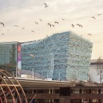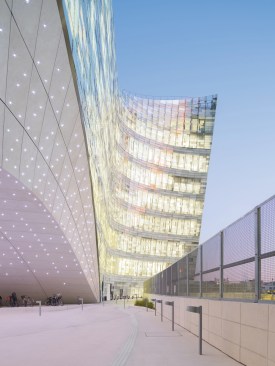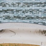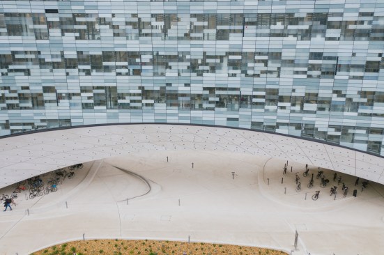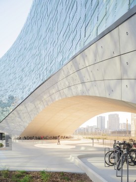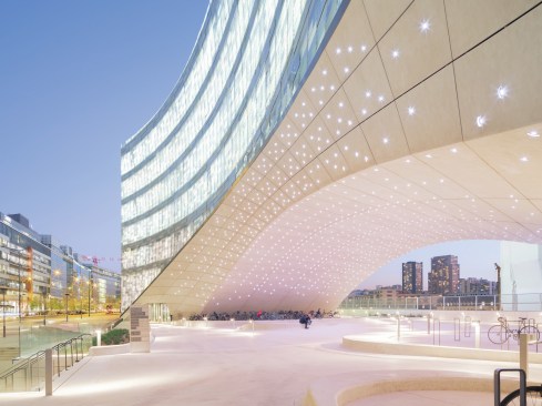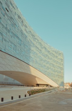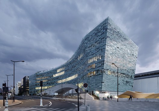 Sitting adjacent to the historic Gare d’Austerlitz train station, the project is a close neighbor to the historic Latin Quarter and the lushly planted gardens of the Jardin des Plantes. The concave form of the building bridges over the below-grade railyard, anchored on both sides with two seven-story cantilevering volumes held together by a complex network of steel. Three gestural «cuts» shape the building mass: the «sky cut» reveals the oblique surface of the solar-panel-clad roof; the «city cut» pulls the building back from the along its street-facing facade; and the «ground cut» carves out the underside of the bridging structure, enveloping the new public plaza together beneath its expansive arched form.