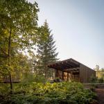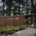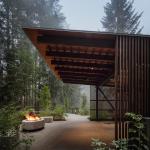 “Leach Botanical Garden serves a diverse community by providing a place to gather in nature. The new tree walk provides a unique perspective of the landscape, both immersed in the textures of the forest and looking out over the canopy to the river and hillside beyond. As the starting and ending point for the tree walk, the arbor and fireside terrace establish a sense of embarkation and arrival, as well as a spot to linger out of the elements. The roofline gestures to the tree canopy, while the cantilever creates a dramatic moment—and vital shelter—as it reaches toward the fire,” says design principal Kevin Kudo King, AIA, LEED AP