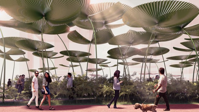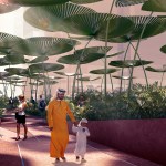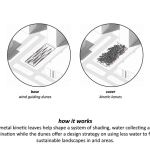 while the elements of “leafy” protect the ground level from higher temperatures, the dune-shaped base offers a platform for local plants and vegetation, helping to generate a hybrid “cool” oasis where people can chill and freshen up, a breathing space during lunch breaks or city tours.