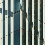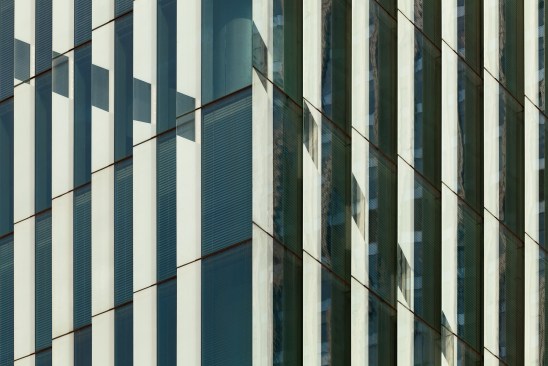 The facade is developed in relation to both, the structural diagram and the energy strategies, as a tightly constructed twin shell made of vertical glass shingles. They reflect solar heat gain and reduce heat transmission by the fritting of its surface and through the ventilated cavity between the inner and outer layers. Horizontal blinds shield the interior environment from direct solar load and control brightness.