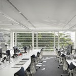 The eastern section of the building is spaced apart from its neighbors to create internal courtyards and provide natural lighting on two exposures for all office spaces. Generous vertical gardens tie these open-air atriums into the exposed concrete core of the building. The entire project straddles between the refined precision of a white aluminum-and-glass free-plan office, and the roughness of concrete and the vegetation within the courtyards.