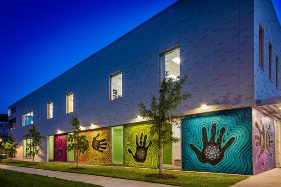 For the exterior of the building, the client worked with local Houston artist Reginald Adams who was commissioned to design the colorful wall mural. Tiny tiles for the intricate stone mosaic were created by staff and community members, continuing to tie the space in with the surrounding community.