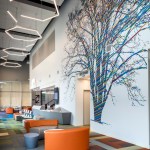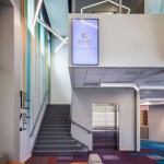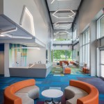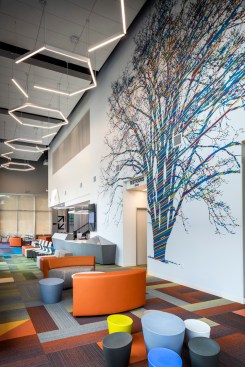 Colors and bold graphics play an important role in wayfinding (different colors are used to identify different service lines), and moveable furniture is more family-friendly for patients in waiting areas. The large staircase in the two-story lobby helps improve traffic flow, while offering an inviting and colorful welcome to the second floor.
