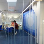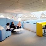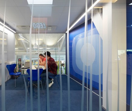 In order to create a design that matches the creative development process in the department, the imagination was given free reins. Across the large space, an existing walkway was turned into an oversize seating area with a light blue colour that transforms the walkway into a light, fluffy cloud. The cloud twists and turns and unfolds to form sofas, sitting podiums and a slide that connects the two floors.