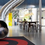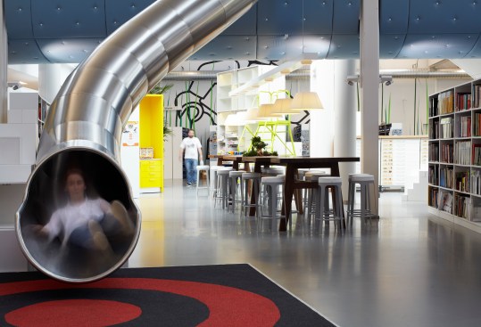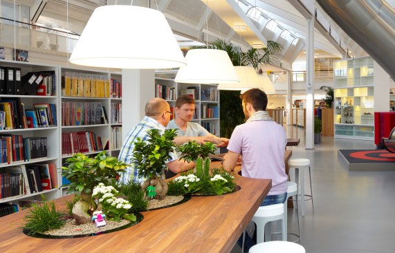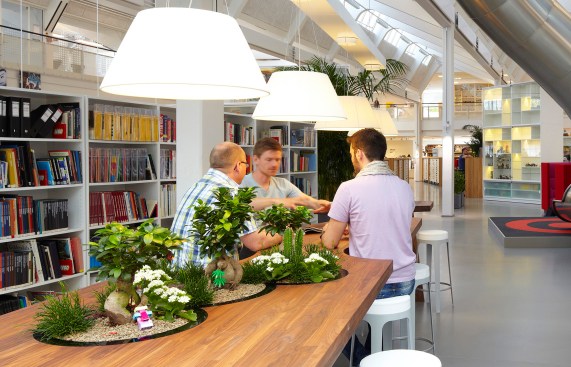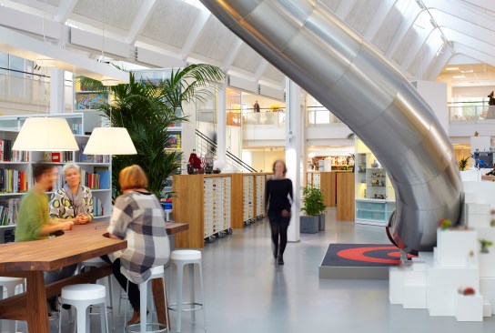 Wall papers with giant blades of grass, tables with built-in bonsai gardens and a slide connecting two floors. The LEGO Groups development department has a new working environment with an emphasis on fun, playfulness and creativity, where the physical design lets grown-ups enter a child’s fantasy world.