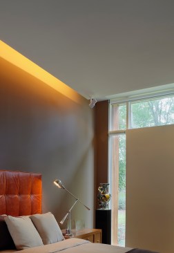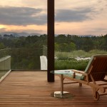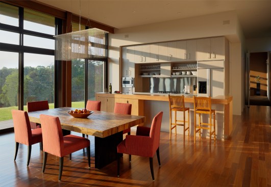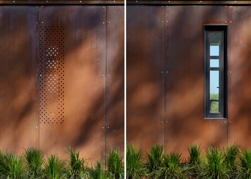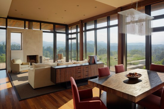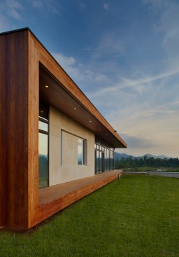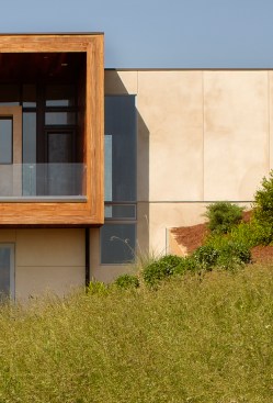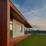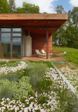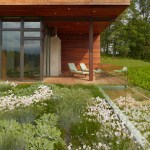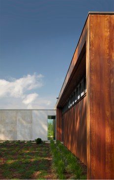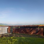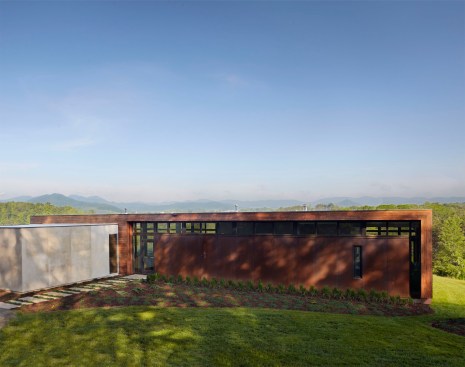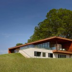This hilltop residence, located at the edge of a wooded knoll in the foothills of the Blue Ridge Mountains, has expansive southern and western views. Approaching through the woods, one arrives at a one-story façade of corten steel framed by wood. A hint of the views is provided through the glass door, but it is not until entry that the full impact of the hilltop views can be experienced. The south and west glass walls open to rolling farmland below and the mountains beyond. The entry level serves as the primary living area, with a guest wing carved into the hilltop below. The house is functional, energy efficient and visually inspiring. The ‘greening’ of the house complements its visual warmth, grounding the modern structure in its rural landscape.