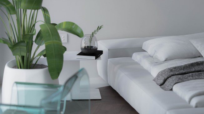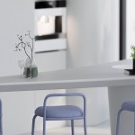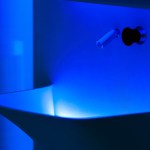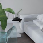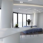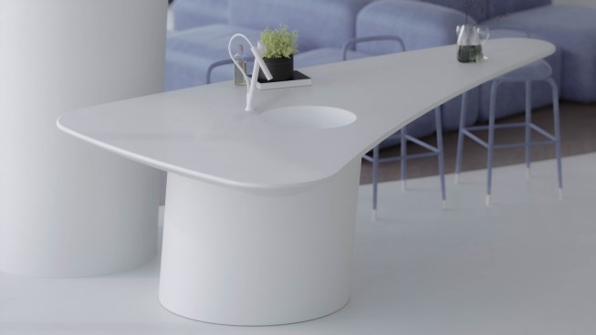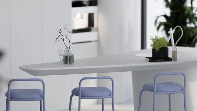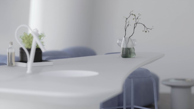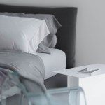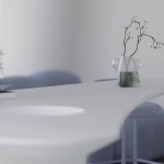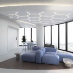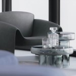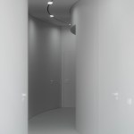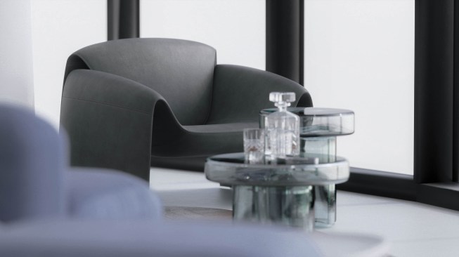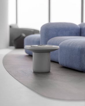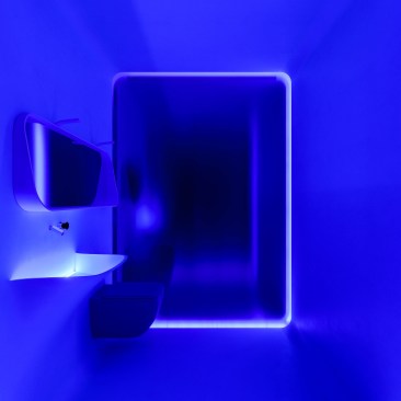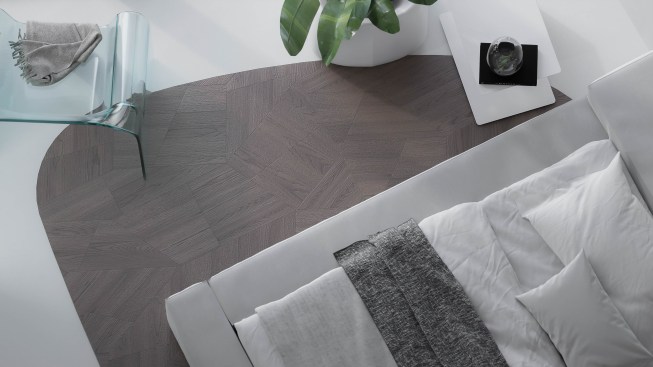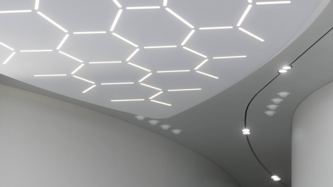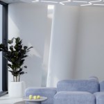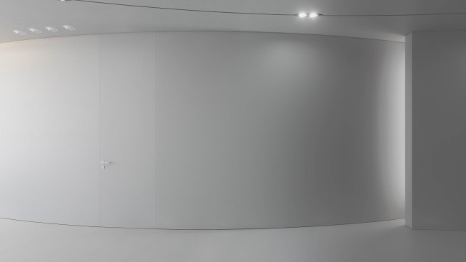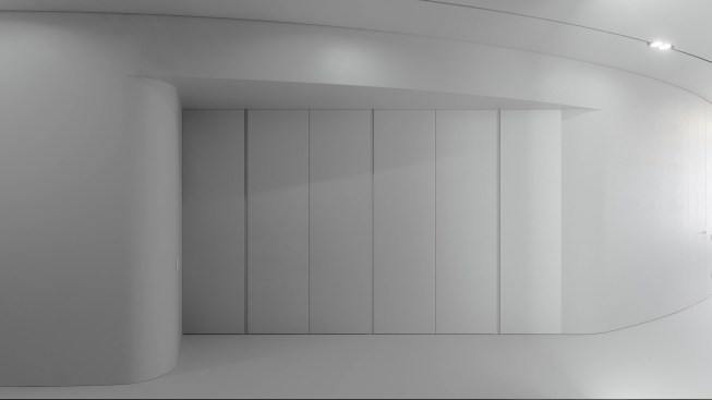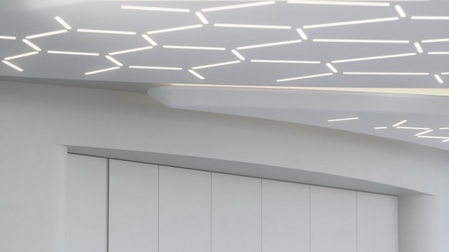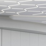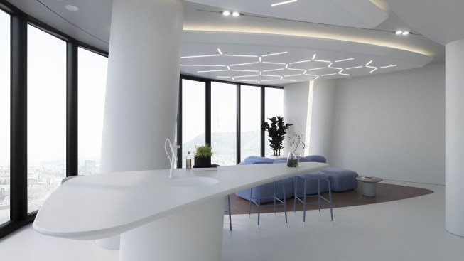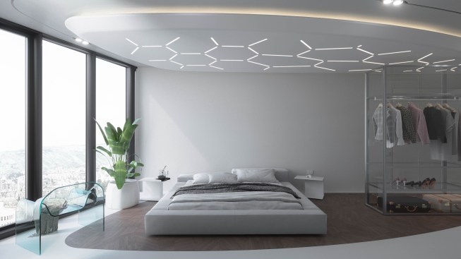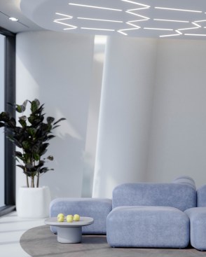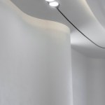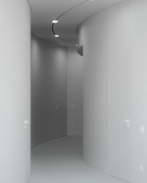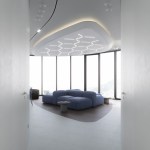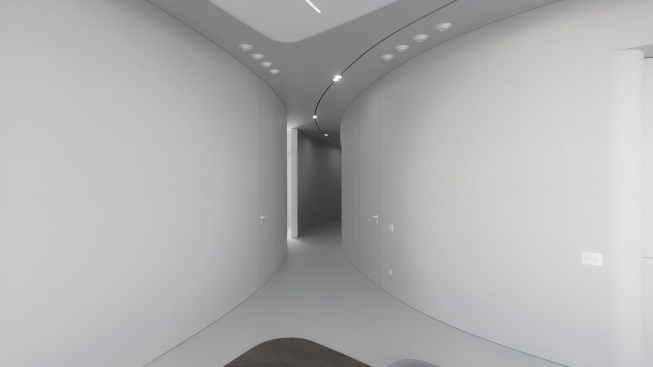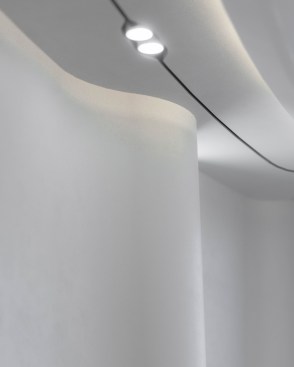 Four core silhouettes are present throughout the apartment ceilings and the parqueted areas of the floors. These shapes are distilled from the hand-sketched outlines, adding a human touch to the futuristic forms. Wooden floor zones and custom white forms on the ceilings are the cozy blips in the large monochrome surface areas.