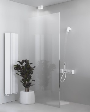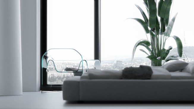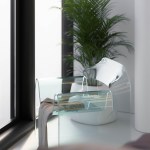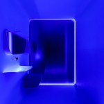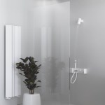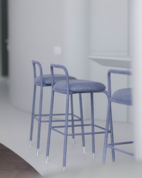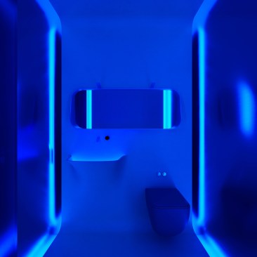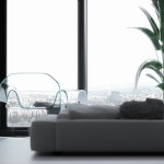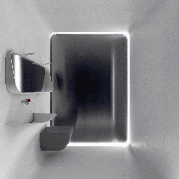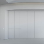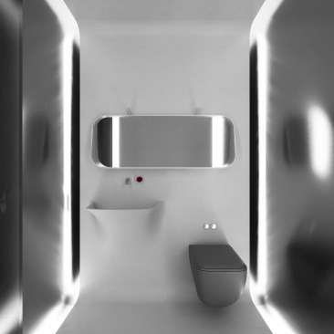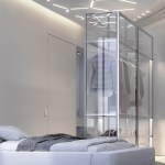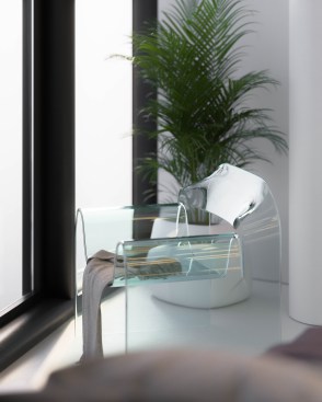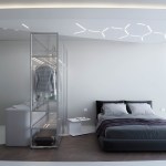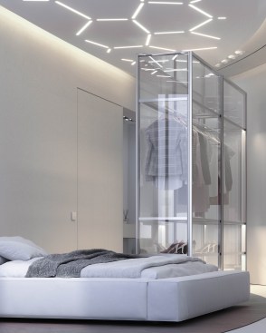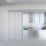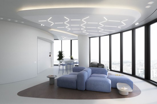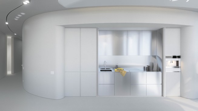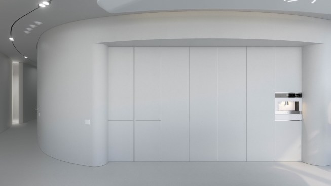 The modern oval-shaped building exterior influenced the development of interior aesthetics. The apartment looks over the city through the curved glass walls, through which daylight diligently pierces the space and playfully bounces off of the convexed surfaces of the apartment. The entrance corridor narrows down midway and broadens up eventually into the living room, embracing the daylight with a swinging impact. More secluded rooms of the house are animated with reflective elements like freestanding glass wardrobes and two stainless steel walls in the guest bathroom accentuating the RGB lighting. Stainless steel is reiterated in the kitchen, which can be partitioned from the living room with a sliding door, leaving only a decorative kitchen island exposed.