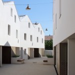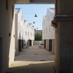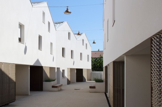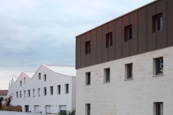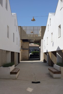 La maison en pierre est surélevée pour accueillir trois logements. Le bâtiment neuf voisin accueille 7 appartements. Sur le reste de la parcelle dix huit maisons en bande se développent face à face, autour d’une rue minérale. Elles reposent sur un socle métallique reprenant l’écriture et la matière du pont sur la rue, permettant ainsi de générer une unité.