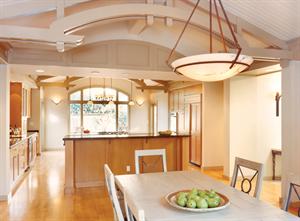 The extended space sits under a new gabled roof that runs perpendicular to the existing ridgeline. Beneath it an open plan relies on two kitchen islands, cabinetry, and ceiling trusses to break the space into three: breakfast nook, kitchen, and dining room. The arched trusses add Craftsman character to the space and echo its large arched windows.
