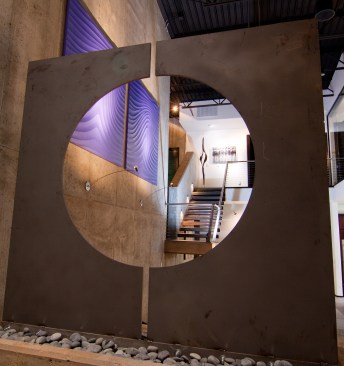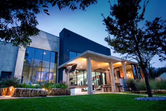 The Lewis residence is located on a sloping, water-front lot on Lake Hiawassee, a private lake in central Oklahoma. The site slope and lake views create a strong connection between the natural environment and the home’s interior spaces, a key design consideration for this residence. The use of large, lake-facing windows blur the lines between interior and exterior spaces of the house, yielding a modern, open entertainment space. The back patio serves as a key transitional element, both spatially and functionally. Distinctive areas of the patio respond directly to the local climate, creating an ideal setting for year-round enjoyment: a screened outdoor dining room with sliding windows can be closed in winter months; a covered, open area with outdoor kitchen and bar remains open for the summer months; and a fully-outdoor, exposed area featuring a fire pit is ideal for cool Spring and Fall evenings.