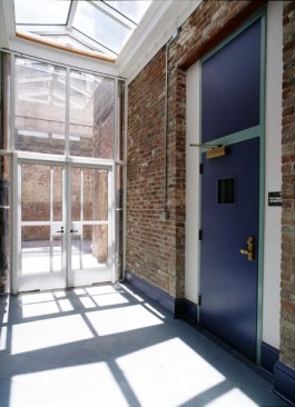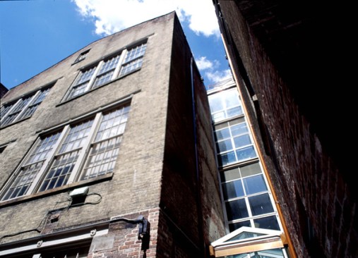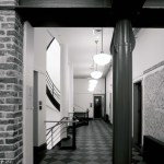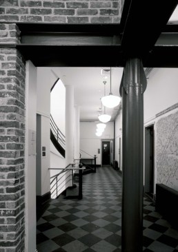We inserted a generous entry lobby with a three story ornamental stair lighted by a new skylight. On each floor, we built new hallways, ending in a floor to ceiling glazed curtain wall providing light and view. Juxtaposed against this new work are exposed, previously exterior, masonry surfaces and many fragments of the Stonewall Art Show. This archaeological approach retains the building’s historical layering while celebrating its new life.