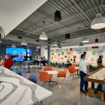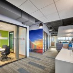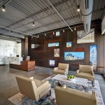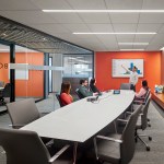 An inviting reception area with alcove seating immediately greets employees as they step off of the elevator. Next to the reception is a “town center,” which replaces the traditional office kitchen and provides a zone for employees to eat, collaborate or relax. A custom shuffleboard offers an opportunity to bond with coworkers and plays into Liberty Property Trust’s goal of fostering a creative and collaborative environment. Past the town center are a number of workstations spread across an open floor plan. Opting for a layout without private offices, FCA integrated an array of small breakaway areas, informal lounges and meeting rooms for working, collaboration, and discussion. Throughout, the industrial palette is juxtaposed with vibrant accent colors, polished concrete floors and a metal accent wall to give nod to Liberty’s focus on the industrial sector, while maintaining the company’s modern outlook.