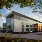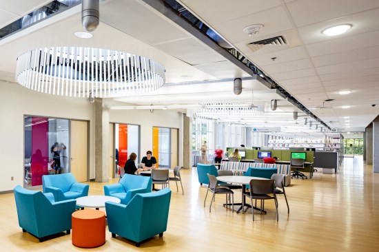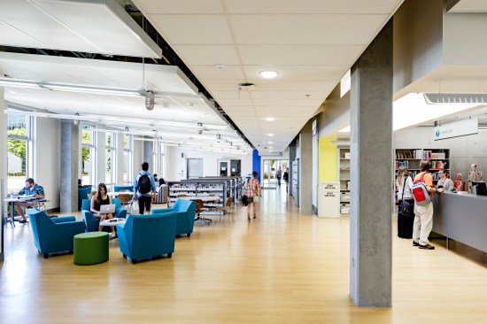This pair of three-story buildings frames a plaza and creates a bustling hub for student activity. Serving a diverse student community that reflects a growing international population, the Library (LEED Gold) and Student Commons (LEED Silver) were created to engage students with a wide variety of academic and career advising needs.