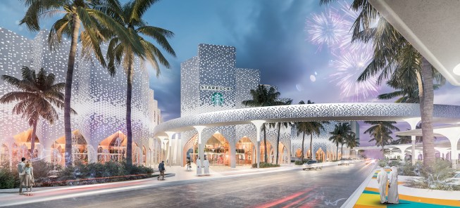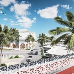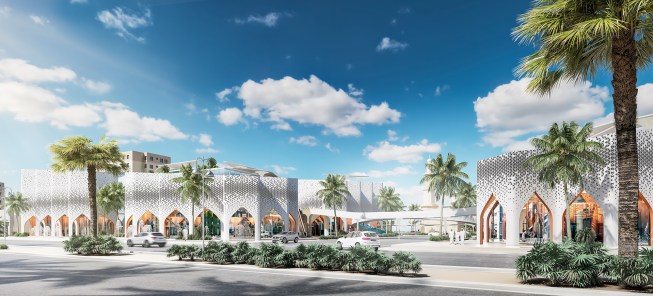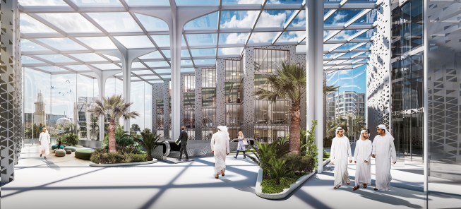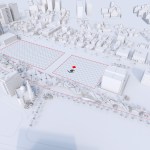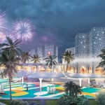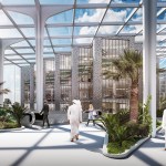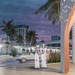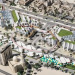 As for the park, its territory is hidden under canopies that adhere to our idea and are deployed on a grid. They serve not only as protection from the sun’s rays, but also accumulate their energy during the day and give off in the form of a glow in the evening. This enlivens the whole complex as a whole. Since the project area is located next to the water and the sand rises up, such canopies operate as additional protection from dust. Any type of event can be held in such a park. From the side of the children’s block there is a quieter area, and from the side of the shopping center there is a lively one. Another feature is the stream (fountain) through the entire park – this is another line of life, growth from children to an adult. You can also enjoy the singing fountains and relax under the canopies. An additional entertainment is a bike path through the park and the ring.