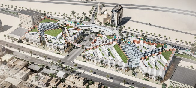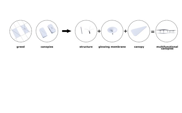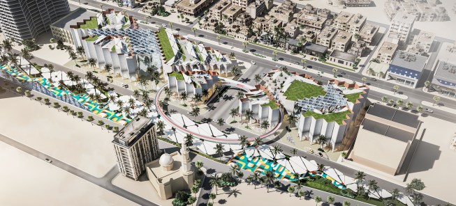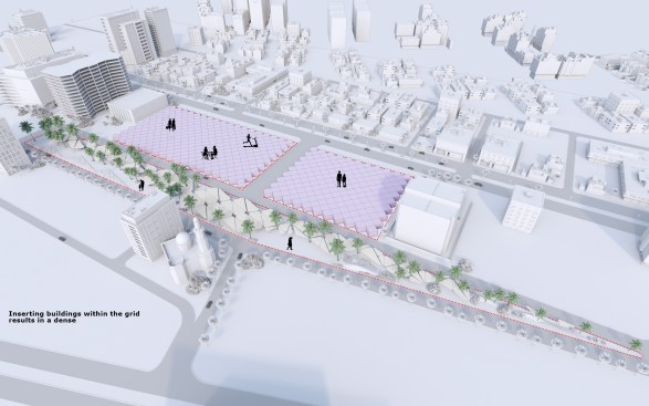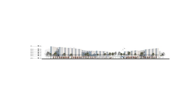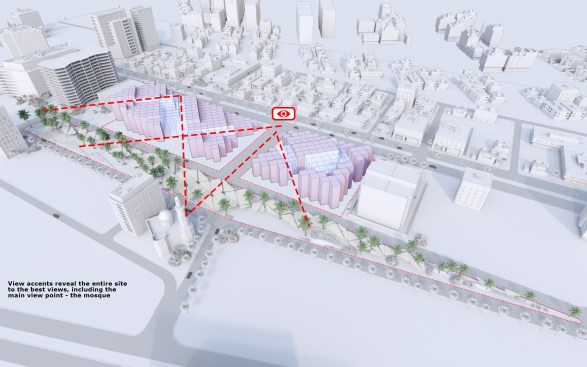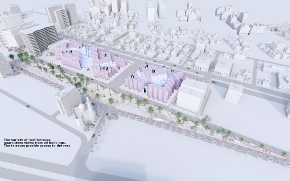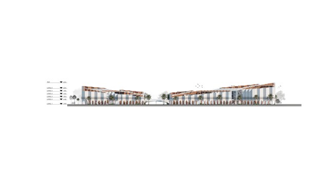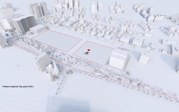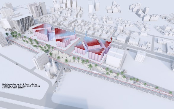 The idea and name of our project is formed and reflects the history of this place. Old buildings are located at an angle of 45, so we would like to preserve this feature in our project by placing a grid of columns at the same angle, thereby linking history and the future through lines. This is the main advantage of the project, so due to the intermittent facade, a small amount of direct sunlight will fall, including the facade will accumulate less sand on the surface of the walls.