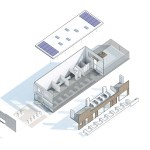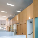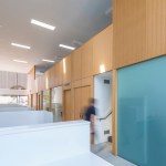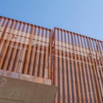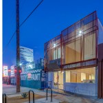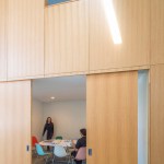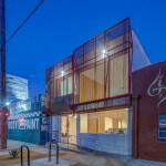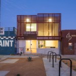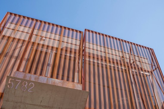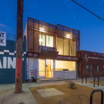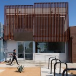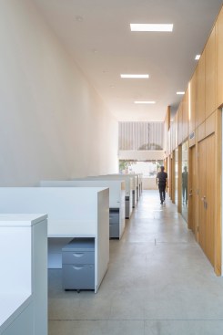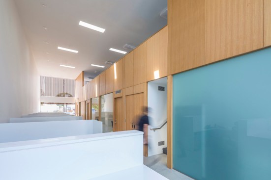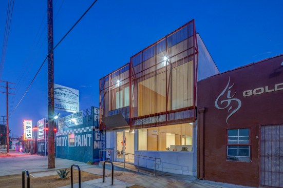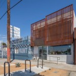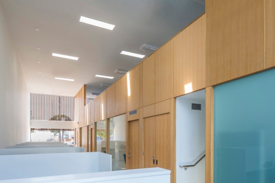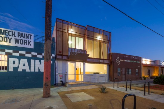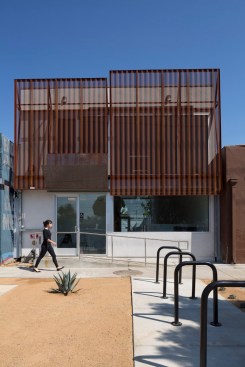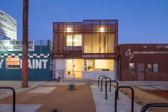 In response to the contrasting goals of an open and naturally lit, yet secure and private working environment, the “Light Box” is fitted with an array of skylights within the ceiling slots at the roof and a perforated steel screen at the Venice Boulevard façade. The skylights register the time of day through the constantly changing light on the wood interior. In addition, the scale and orientation of the façade screen provides diffused lighting in the afternoon and presents an illuminated edifice by night to safely light the sidewalk and bike parking at the street. Ultimately, the “Light Box” serves as a device to both capture and emit the quintessential glow of Los Angeles.