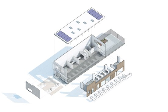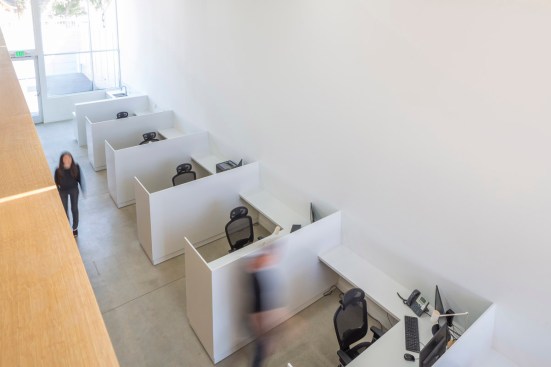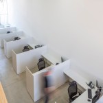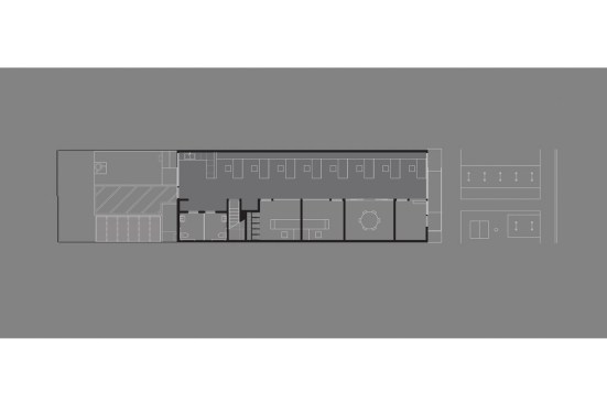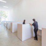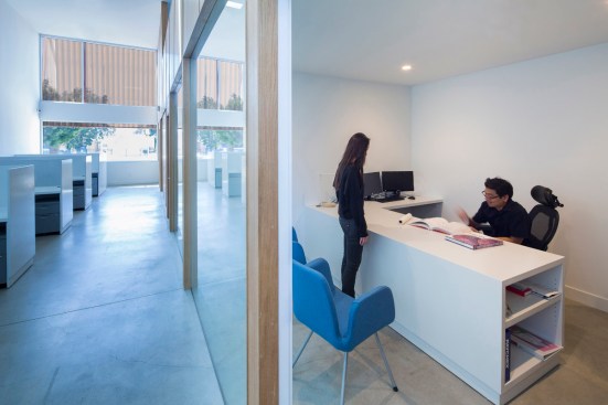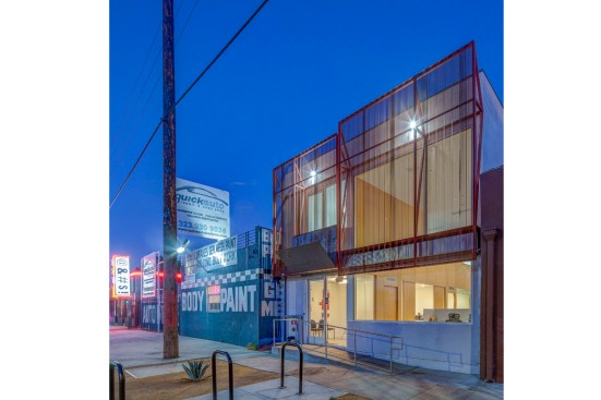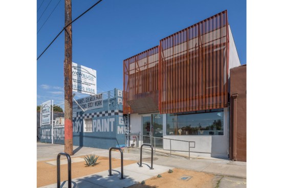 On a gritty stretch of Venice Boulevard in Los Angeles, the PSPMLA office sits on a previously vacant 2,500 sf infill commercial parcel. Dubbed the “Light Box” for its simple geometry slotted in acknowledgment of the natural solar conditions, the 2,200 sf office for a boutique property management firm discretely slips into the streetscape of tightly packed auto body shops, neon sign fabricators, digital printers, and various light commercial businesses. The design expands upon the urban texture of the street, while also carving out a bright, naturally illuminated respite for the office staff and their clientele.
