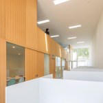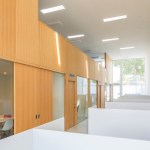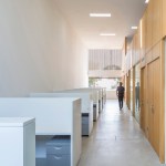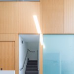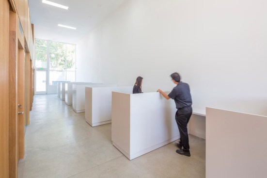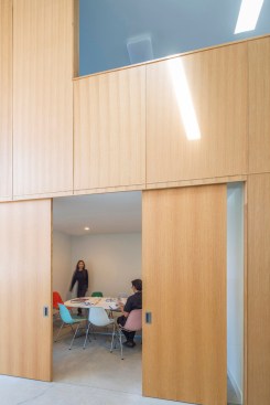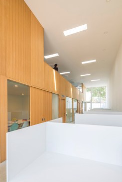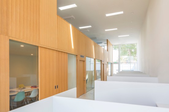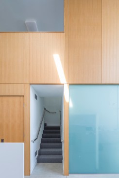 The project is composed of two primary furniture elements, a double height rift sawn white oak clad spatial volume and a white lacquered cluster of seating modules, inserted into a 25’-0” wide X 66’-6” long X 22’-6” tall building envelope. To maximize the useable area of the narrow lot, the exterior walls were assembled and waterproofing installed horizontally on site and then tilted into position along the property lines with a crane. Following the completion of the envelope, the furniture elements were installed within the space. The office’s interior is organized into three zones of program: the double height ground floor area contains the primary circulation and the staff seating; the ground floor of the wood insertion is populated by the waiting room, conference room, two management offices, and the restrooms; and the mezzanine holds additional staff workrooms and storage areas.