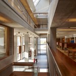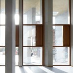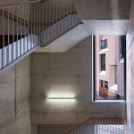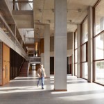 Facing the housing accommodation is the medical school, which is cool grey and monolithic, another relatively modest building with a strong presence. The central space of the medical school soars above the entry, rich in timber detailing set against massive concrete expanses, with views up to a study area overlooking the atrium, and further still to bridges and windows on higher levels. This building feels like it punches well above its weight. It transforms simple teaching and study spaces into rich, theatrical spaces, with a generosity that verges on the heroic.