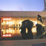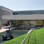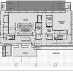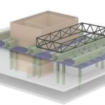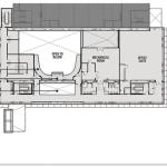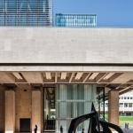 The rooftop addition rests on six concrete structural columns in the existing building, bridging the gaps between them with steel trusses. The architects punched through one of Saarinen’s concrete ceiling coffers to accommodate a channel-glass-enclosed elevator shaft, which connects the new 112-seat theater to the existing lobby. Aluminum screens prevent excessive heat gain and break up the addition’s mass. Clad in glass, the orthogonal building corresponds to Saarinen’s midcentury aesthetic beneath it. Now there are three main horizontal registers: Saarinen’s hulking concrete entablature, with the original glass curtainwall lobby directly underneath, and the new glass addition above.