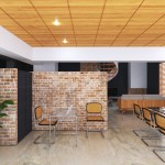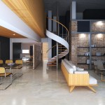 Step1 A folded to an L-section plane is inserted to accommodate 2 of bedrooms the loft’s bedrooms and rests on the concrete beams. It is lined externally with wooden panels while the linear elements of the concrete building frame (columns and beams) remain free and get painted white in order to express the building’s structural system. In the open space, under this wooden element, a kitchen, a dining room and an office enjoy the warmth of the material. Outside it, a double height space –the core of the residence– is offered for the living room with the fireplace.