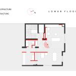 The surface of the apartment at the lower level of the entrance is 74m2. The SW corner of the apartment is being invaded by the building’s central stairwell –with dimensions of 3,70×4,60×2,70m– whose terrace leaves an average free height of 2.20m up to the roof. Also, two free columns are crossed with free beams of the structural frame.