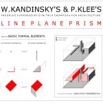 Extruded to the third dimension, the POINT, the LINE and the PLANE become a LINE, a PLANE and a PRISM, correspondingly. (see TABLE OF BASIC FORMAL ELEMENTS FOR SPACE COMPOSITION)