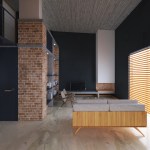 Step 2 The third bedroom of the residence is located on the terrace of the cubic “tower”, viz the central stairwell. Getting lined with brickwork, up to a height, this prism creates a microenvironment close to the human scale, with a strong theatrical character at the same time. The entrance door, the only opening through the prism, is shifted to a position that does not hinder the furnishing of the living room.