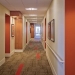 A well-designed series of interior common spaces brings the community-minded aesthetic of the exterior indoors, with careful attention paid to small details in corridors, lobbies, and stairs. The play of materials, mass, and color also carries through to these spaces, connecting interior and exterior into one cohesive design. Individual units facilitate independent senior living with spacious windows that provide plentiful natural light and views while maintaining a strong sense of safety and security for the residents.