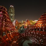 According to P.S.1 Director Alanna Heiss, “To hear five great, young architects present their dream of a temporary pavilion is to fall in love five times. The winner, Ball-Nogues, from the Echo Park area of Los Angeles, gave us a Fellini-esque project: a circus tent whose canvas has been replaced with phosphorescent scales of hallucinogenic colors. This astonishing but low-tech creation cannot fail but to delight viewers of all ages.”