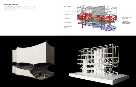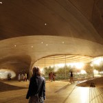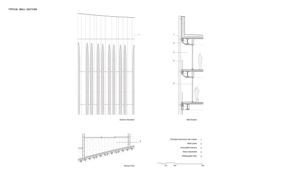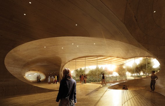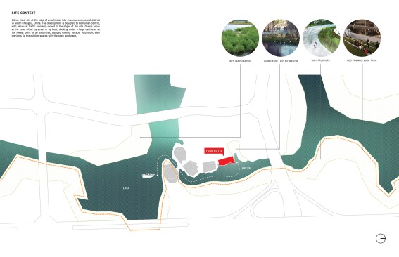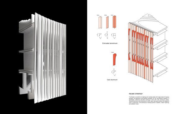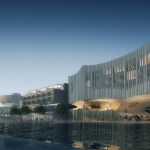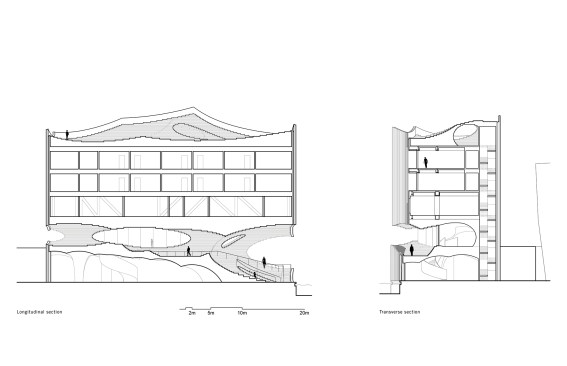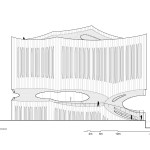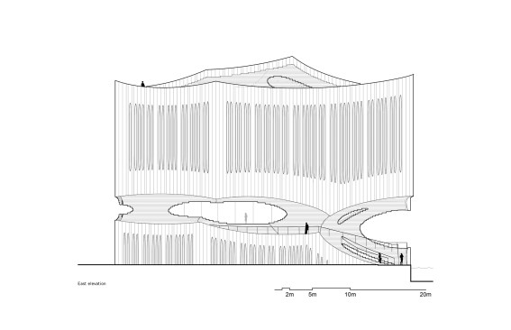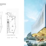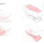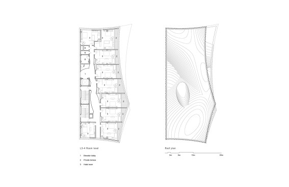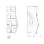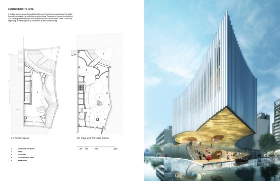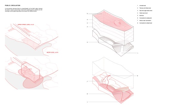 Höweler + Yoon Architecture of Boston has taken its sharp, analytical approach to the burgeoning western Chinese city of Chengdu, producing a hospitality project that promises to become a local landmark. More than just a high-end guest house, the Lithos Wellness Center is slated to be a full-service yoga and wellness retreat, an oasis in the center of the bustling megalopolis. Availing themselves of the lakefront site, the designers created a building that marks a formal and functional break in the quotidian operations of the urban environment. In a fantastic, almost dream-like scene, visitors arrive by boat to find themselves at a plaza-cum-dock seemingly carved out of one corner of the structure. They are then conducted upward via a sweeping staircase to the above-grade lobby, a wide-open bowl of a space unencumbered by interior supports, with the hotel rooms and spa contained in the cantilevered volume overhead. Topped by a garden roof with views over the lake and cityscape, the building wears its meditative heart on its architectural sleeve by way of a cladding system of composite aluminum strips, the vertical ribs giving the façade a steady, soothing rhythm interrupted only by the contoured void of the arrival and reception suite.