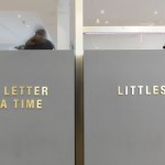 Where the cubes are eroded the plywood interior is revealed. Brass lettering and display rails rise up from these to give a playful counterpoint to the rigid geometry of the cubes.