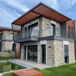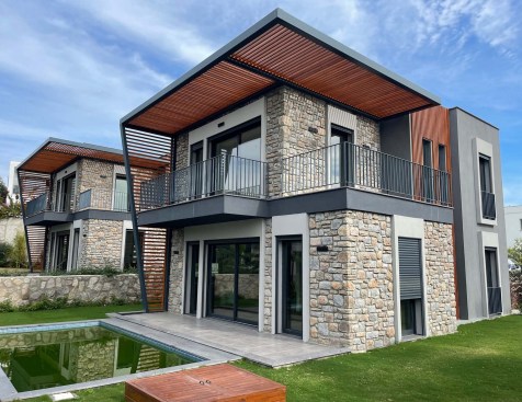 Our main approach in design was to combine natural, sustainable and innovative materials with modern and contemporary forms. In order to allow optimum daylight into the interior, we used the joinery on the facade in large sizes and with a sliding system. We placed wooden dividers on the balconies. Our principle here is that we want to preserve the sense of privacy of all villas and create the perception of contemporary form with this wooden pergola that expands as it goes up. The natural stone we lay irregularly on the facade not only adds a stylish appearance to the building, but also ensures that it keeps the building cool in summer and warm in winter. The facade created by natural stone, wood and metal panels fits exactly the way we express the modernity and sustainability perception we want.