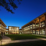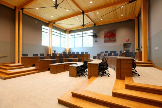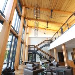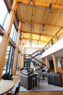 Use of the material continues to the interior, where it’s incorporated as ceilings in the conference room, lounge, gym, and corridors. Custom cypress millwork also can be found at individual workstations throughout the building. In all, the visually striking structure features 50,000 board feet of cypress.