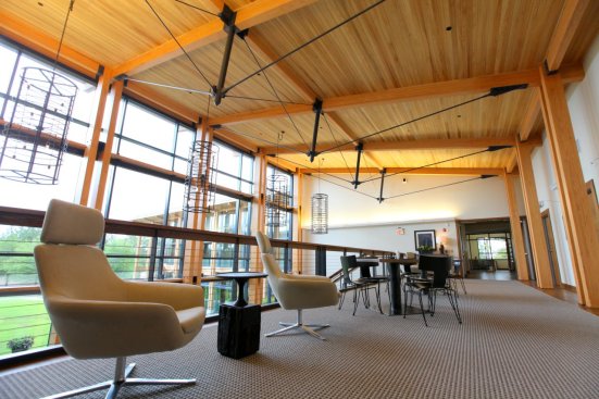 The new headquarters of Live Oak Bank in Wilmington, North Carolina, is a stunning reflection of the institution’s attentiveness to the environment, its customers and the well-being of its employees. With views of tall trees, a pond and an occasional coyote, it’s an employee’s dream workplace. Couple that with the use of locally sourced cypress and the U-shaped building looks more like a recreational lodge than a bank!
