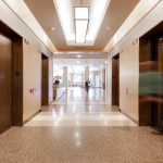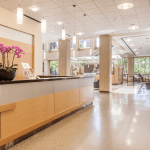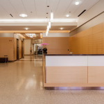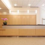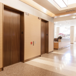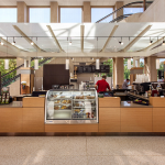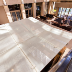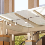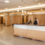 A recent and dramatic lobby renovation incorporated a number of Forms+Surfaces products. ViviChrome Chromis glass panels in Taupe adorn their reception desk and elevator transoms, and ViviGraphix Graphica panels with Silkworm pattern comprise the roof of the coffee stand in the atrium.