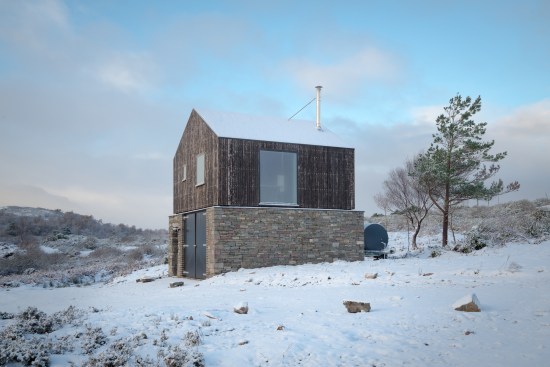 The very energy-efficient structure uses highly-insulated SIP panels, prefabricated to minimise transport of materials. The cladding is Scottish larch, charred by the contractor using a variation of the traditional Japanese shou sugi ban technique to achieve naturally varied rich colour and improved durability. The house will be completely off-grid, with its own water supply, sewage treatment and electrical system, all designed to minimise energy use.