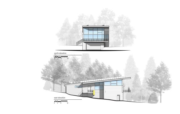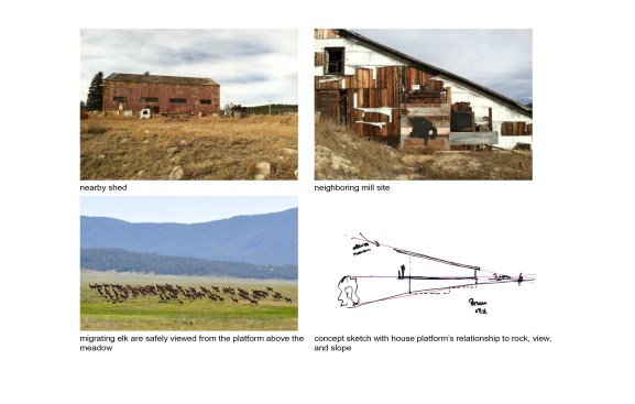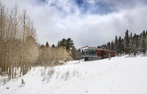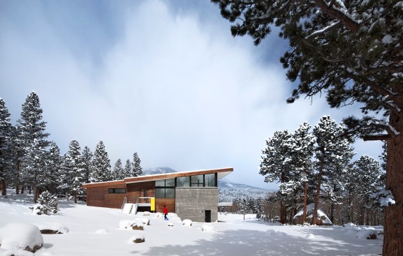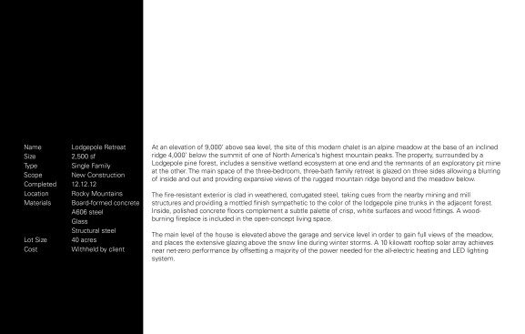 At an elevation of 9,000 ft. above sea level, the site of this modern chalet is an alpine meadow at the base of an inclined ridge 4,000 ft. below the summit of one of North America’s highest mountain peaks. The property, surrounded by a Lodgepole pine forest, includes a sensitive wetland ecosystem at one end and the remnants of an exploratory pit mine at the other.