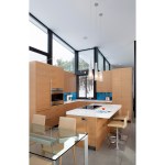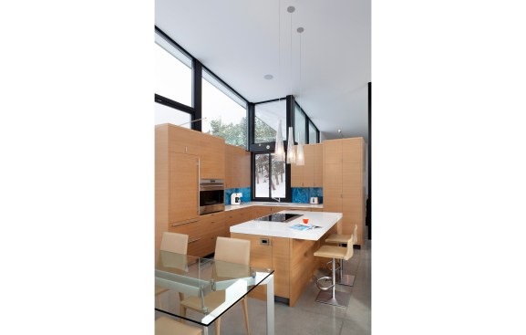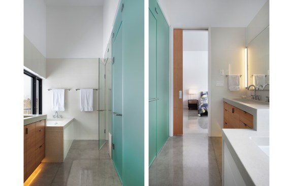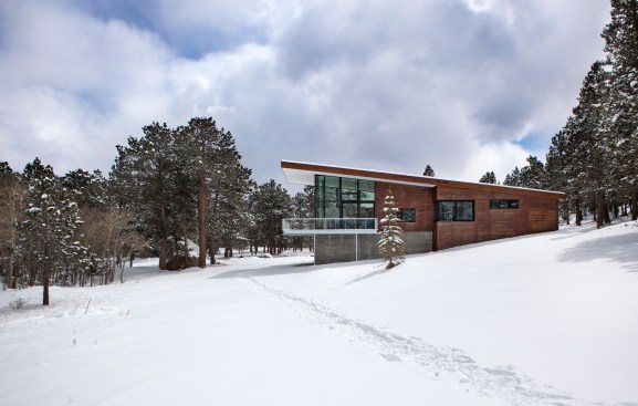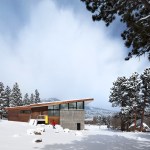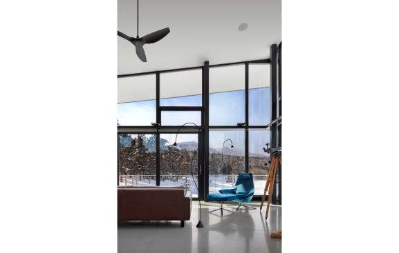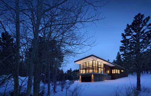 The main space of the three-bedroom, three-bath family retreat is glazed on three sides allowing a blurring of inside and out and providing expansive views of the rugged mountain ridge beyond and the meadow below. The fire-resistant exterior is clad in weathered, corrugated steel, taking cues from the nearby mining and mill structures and providing a mottled finish sympathetic to the color of the lodgepole pine trunks in the adjacent forest. Inside, polished concrete floors complement a subtle palette of crisp, white surfaces and wood fittings. A wood-burning fireplace is included in the open-concept living space. The main level of the house is elevated above the garage and service level in order to gain full views of the meadow, and places the extensive glazing above the snow line during winter storms. A 10 kilowatt rooftop solar array achieves near net-zero performance by offsetting a majority of the power needed for the all-electric heating and LED lighting system.