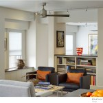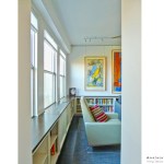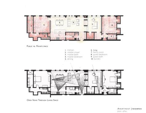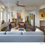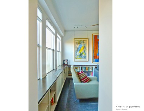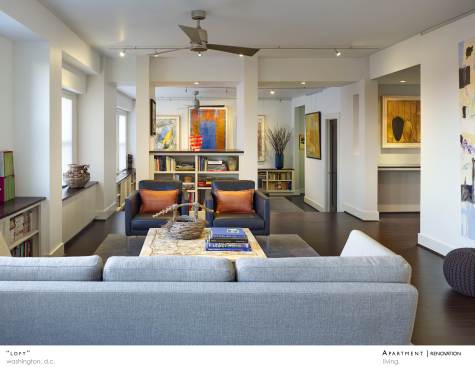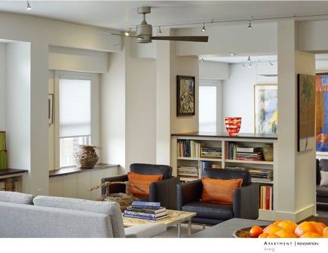 The design strategy was the “barbell” notion of two separate bedroom suites on either end of a large central space, or courtyard for living. One design device that helped with the negotiation of some immovable pipes was the placement of “piers” within the open space. These doubled as buttresses for a bookcase and A/V center right at a transition between differing floor levels, without interfering with the feel of the open court reading.