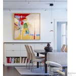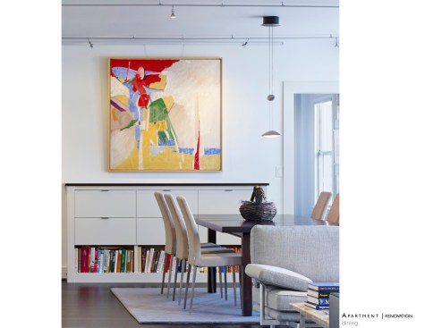 This open “loft” is lined with windows on one long side and with services and storage on the opposite. The kitchen is tucked into the storage side, yet is open to and opposite where the dining “room” makes its place within the overall expanse.