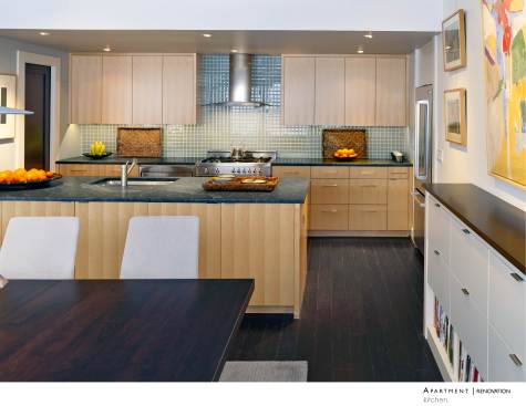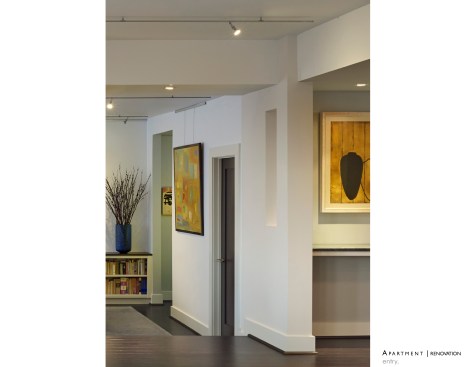 Combining two apartments is a classic challenge. The discovery of utilities and immovable vertical chases that penetrate the apartments at random make the design process into a game of sorts. In this forced trial and error process, the goal is to achieve the elegance and simplicity of a single apartment.