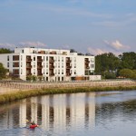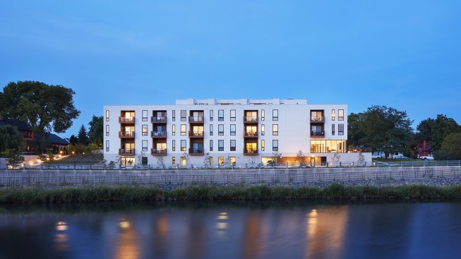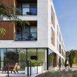 Lofts at Mayo Park is a 29 unit, 4-story multi-family residential project located in Rochester, Minnesota. It is located on the Zumbro River, at the intersection of Rochester’s downtown, Mayo Park and a residential neighborhood. The project needed to resolve the varied scales of its context and balance these responses with the human scale. The design establishes a strong connection between the building, park, the regional trail system, the river and downtown. The building’s common spaces, including a lobby and outdoor patio, are placed adjacent to Mayo Park, providing expansive views. This connection to place also informs the planning of the dwelling units: more than two-thirds of the units have views of the river and downtown. Lofts at Mayo Park embraces the river as an amenity through its tectonics, planning and landscape strategies. The project orients itself towards the river and provides multiple options for experiencing and accessing the river.